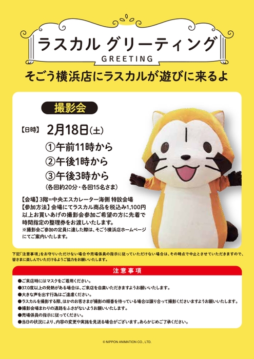2月18日(土)の当日、 「あらいぐまラスカル45thショップ in 横浜そごう」で1,100円(税込)以上お買い上げいただき、撮影会への参加を希望される方に先着で時間指定の整理券をお渡しいたします。参加には整理券が必要になりますのでご注意ください。