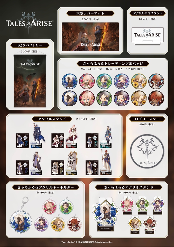 株式会社アルジャーノンプロダクト(本社:東京都台東区、代表取締役:高山 聡士)は、株式会社バンダイナムコエンターテインメントから2021年9月9日(木)に発売される「Tales of ARISE(テイルズ オブ アライズ)」の発売を記念して、ゲーム発売日の9月9日より新作グッズを一部店舗様におきまして先行発売を実施致します。