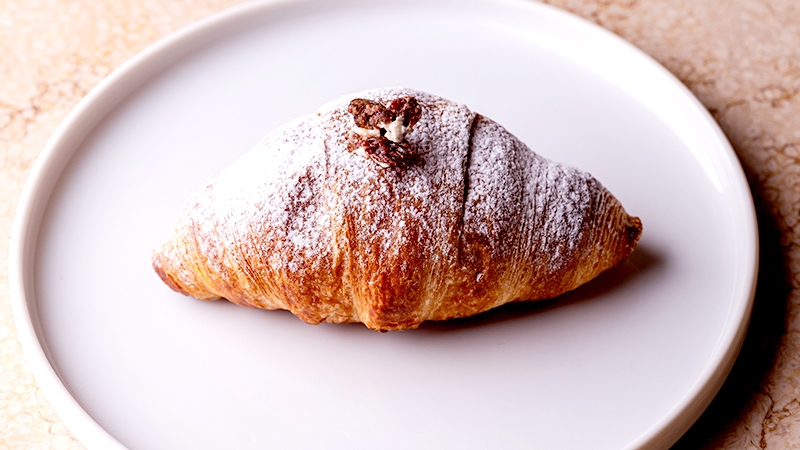 クリスマスの伝統的な焼き菓子「シュトーレン」をモチーフにした、新しいクロッシュが登場!バターを贅沢に使用したクロワッサン生地の中には、ラムレーズンとナッツたっぷりのクリームが。ほのかなシナモンの香りとクリームチーズの爽やかな酸味も感じられる、味わい深いクロッシュです。サクサクのクロワッサン生地とふわふわのクリーム、ナッツのカリッと感…、それぞれの食感の妙も楽しめます。