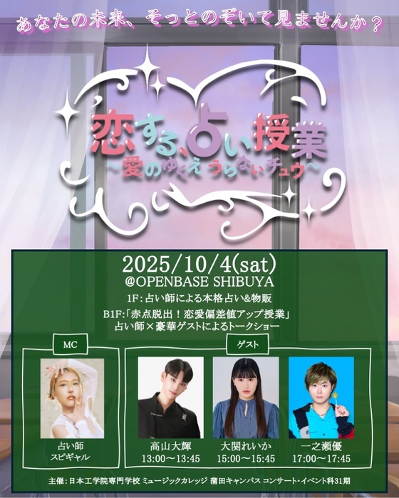 授業の一貫として学校主催でのイベントを行い企画・制作・運営までを行う日本工学院専門コンサート・イベント科イベント企画コース31期は「恋する、占い授業〜愛のゆくえうらないチュウ~」を2025年10月4日(土)に開催します。