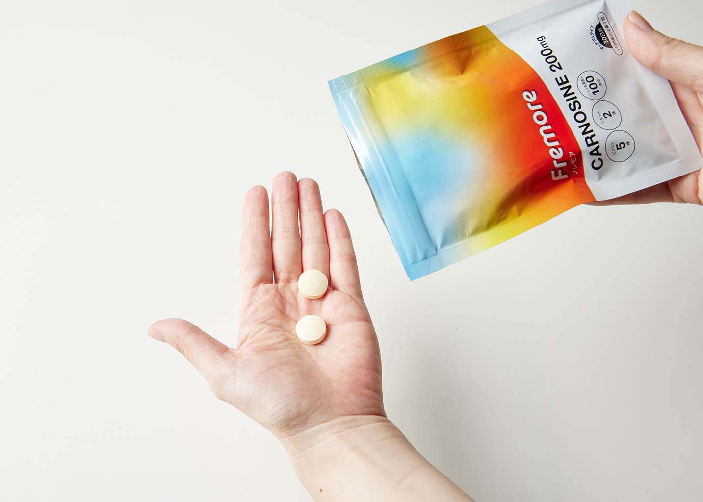 「Fremore」は、注目成分カルノシンに加え、ビタミン・ミネラル・乳酸菌など8種類の成分をバランスよく配合しています。カルノシンが、毎日の活動や運動への意欲をサポートし、「今日も体を動かしたくなる」前向きな気持ちを応援します。