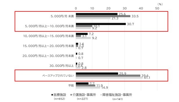 2023年6月から2025年6月までの2年間において、ベースアップがされていない施設は、医療施設で25.9%、介護施設・事業所で39.6%、障害福祉施設・事業所で41.1%が占めました。また、2年間のベースアップの昇給額は、医療施設では5,000円~10,000円未満が最も多く、介護および障害福祉施設・事業所では5,000円未満がボリュームゾーンでした(図9)。
