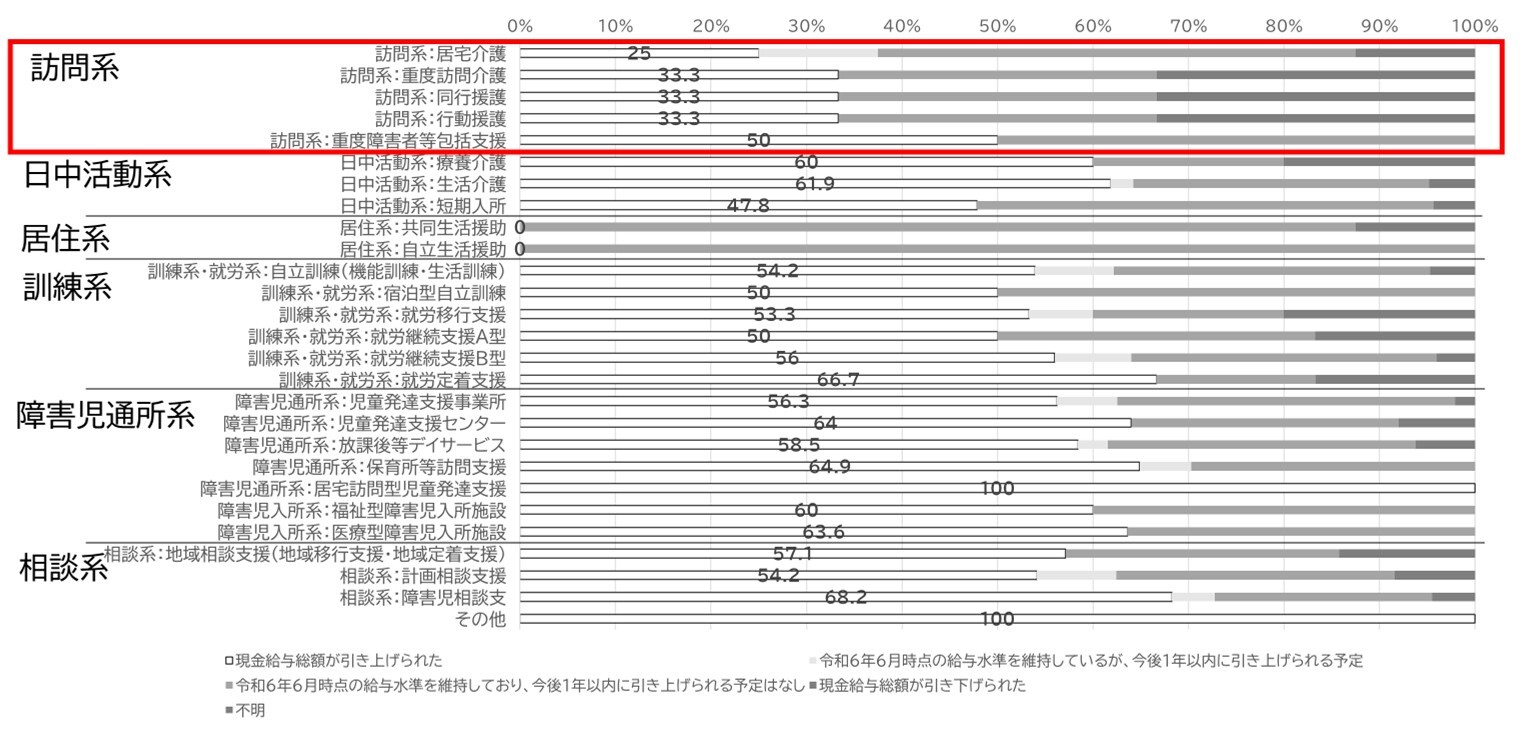 現金給与総額の引き上げを実施した施設は、医療施設で66%、介護施設・事業所で43%、障害福祉施設・事業所で54%であり、昇給が行われていない施設は、医療施設で約3割、介護施設・事業所で約6割、障害福祉施設・事業所で約5割であることが明らかとなりました(図1)。