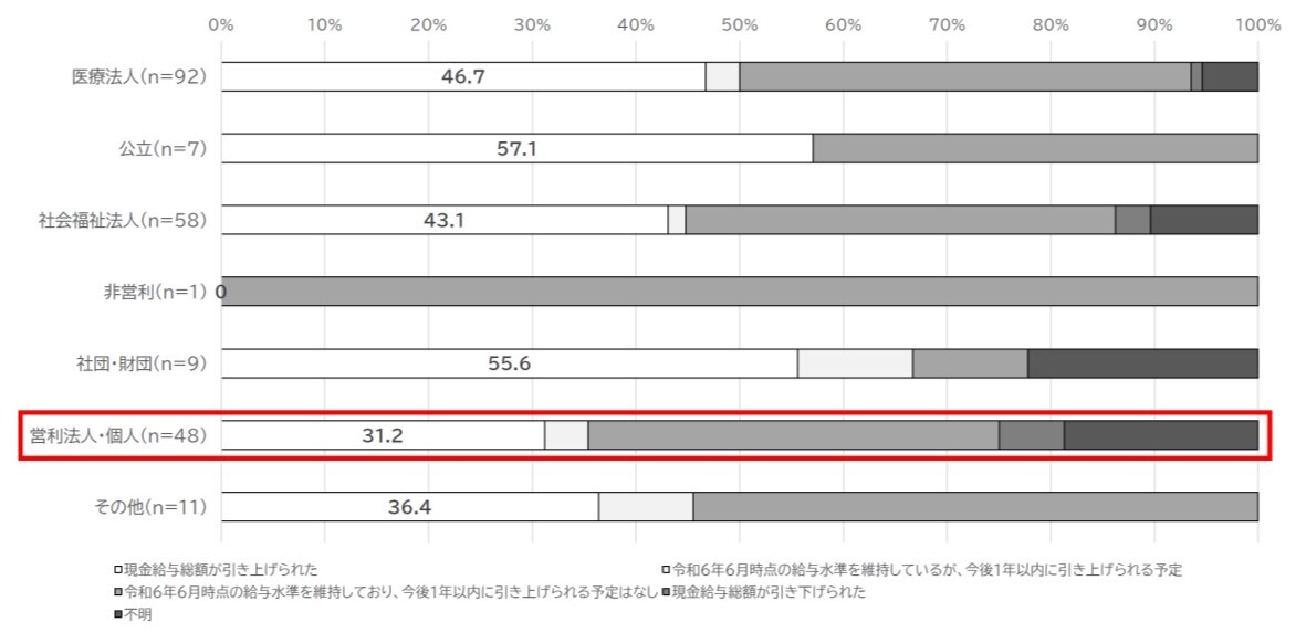 ・開設主体毎の比較では、「個人事業」において給与の引き上げ実施率は42.9%と最も低値でした(図4)。