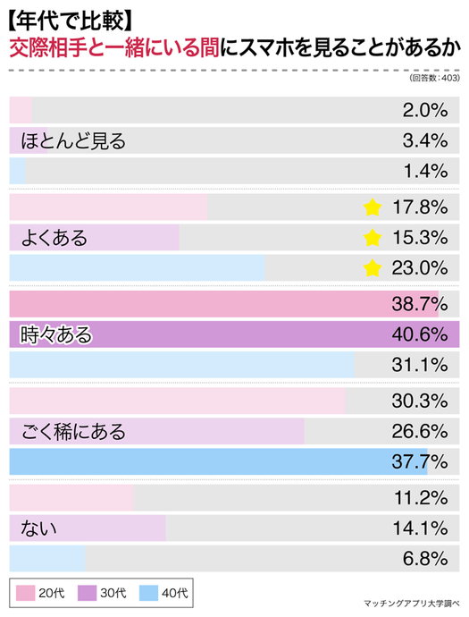 このことから、デート中にスマホを閲覧する頻度において、特に年代による大きな偏りは見られないと言えそうです。