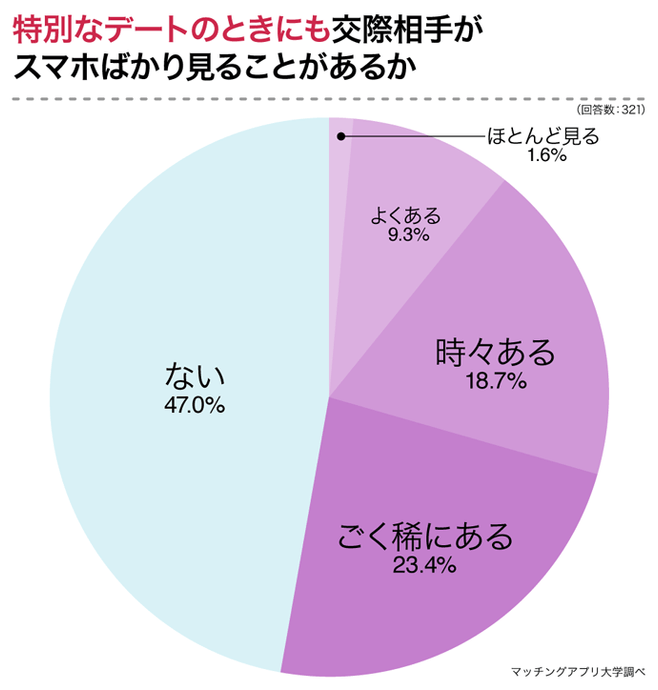 尋ねてみたところ、約半数の47.0%が「ない(デート中にスマホは見ない)」と回答しました。