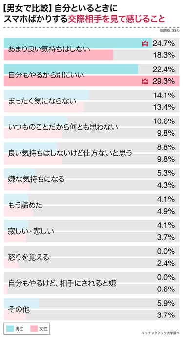 では、交際相手の「デート中のスマホ」に対する感情に、 男女差はあるのでしょうか。