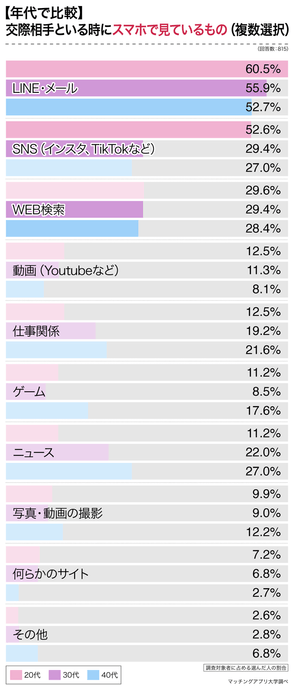 これは、デート中のスマホ利用の目的だけの問題ではなく、SNSに対する価値観が年代によって大きく異なる状況を表したものだとも言えそうです。
