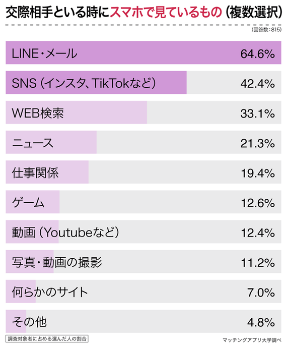 もっとも多かったのは「LINE・メール」の64.6%で、次が「SNS(インスタ、TikTokなど)」の42.4%です。この結果からは、彼氏・彼女と一緒にいながら、他の友人・知人の様子ややり取りも気にしている様子が伺えます。