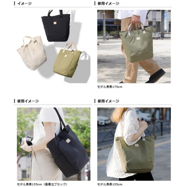 アジャスターでハンドルの長さを調整して、手持ちスタイルにもできる2Way仕様のトートバッグです。