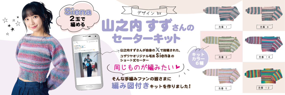 創業70年、日本最大級の手芸用品・生地・ホビー材料の大型専門店『ユザワヤ』を展開しているユザワヤ商事株式会社(所在地:東京都大田区、代表取締役社長:畑中 伸元)は、人気タレント山之内すずさんがデザインしたセーターが編める、毛糸と編み図のセット「Sienaで編むセーターキット」を、10月31日から発売します。
