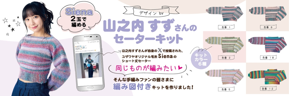 ユザワヤでは、その要望にお応えして、山之内すずさんデザインのセーターを編み図化し、毛糸「Siena」と限定編み図をセットにしたキットを販売することとなりました。