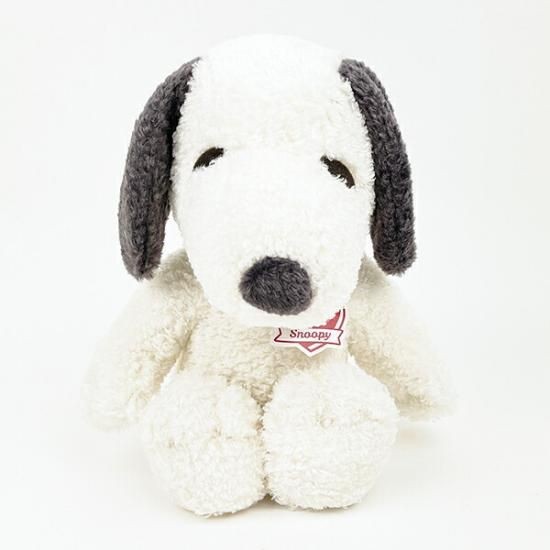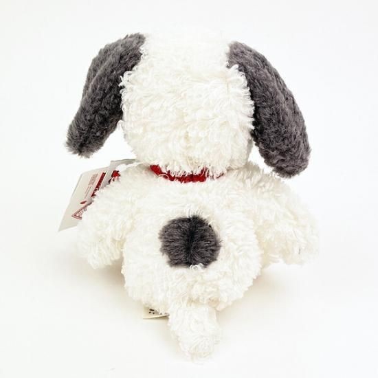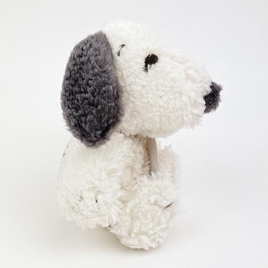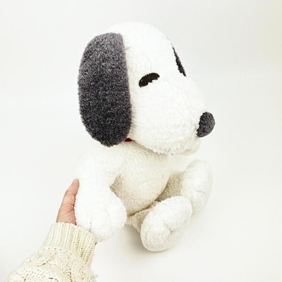 カール加工が施されたふわふわ毛が愛らしい手のひらサイズのスヌーピーは、ちょこんとお座りしやすいボディでとてもおりこうさん。