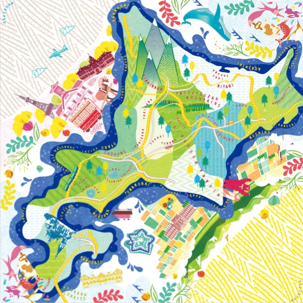 今年のふろしきは、「夏の北海道めぐり」がテーマです。北海道地図をはじめ、観光スポットや、可愛い動物など、見ていてワクワクするようなデザインを描きました。みなさまは、どの地域に行かれたことがあるでしょうか?また、行ってみたい観光スポットはございますか?