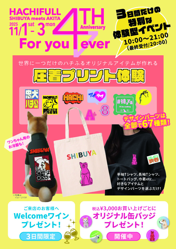 今回のイベントでは、お客様ご自身がデザイナーとなって、世界に一つだけのハチふるオリジナルアイテムが作れる「圧着プリント体験」を実施いたします。