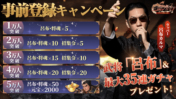 事前登録者数に応じて、正式リリース後に配布されるゲーム内豪華報酬をプレゼントするキャンペーンが開催中!最大35連ガチャ&武将「呂布」がもらえる!