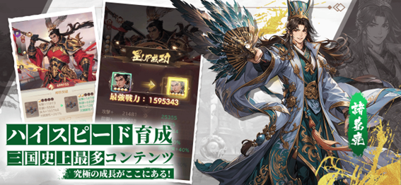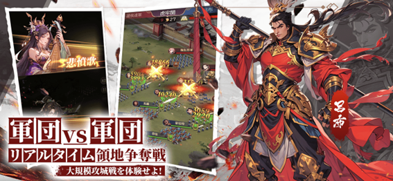 本作は三国志を舞台に呂布、曹操、関羽など名立たる武将たちが登場するリアルタイム領地争奪戦SLGとなっております。広大なマップで軍団vs軍団の領地争いをリアルタイムバトルで体験することができます。