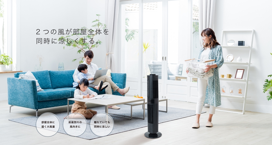 タワーファンの特長はスリムで場所を取らないデザインが人気ですが、風量や首振り範囲が課題となっていました。そこでバーグマンは、本体上下で別方向に風を送る事ができる、セパレートタワーファンを開発。従来のタワーファンに、大風量・広範囲の新しい機能で、夏のリビングに快適な空間を提供いたします。
