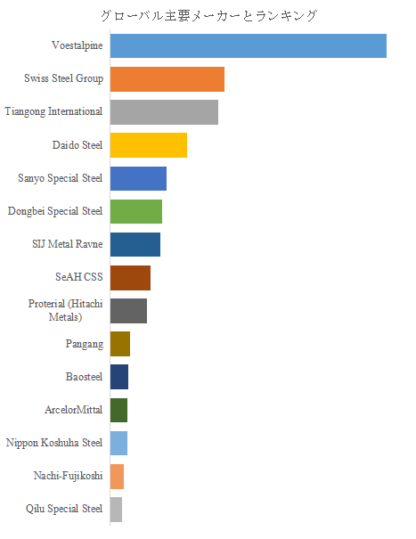 世界市場における主要プレイヤーは、依然として欧州勢が優位を保っている。中でもオーストリアのVoestalpineは、品質・技術革新・サプライチェーン管理の三位一体戦略により市場をリードしている。続いてスイスのSwiss Steel Group、中国のTiangong Internationalが上位に位置し、欧中両地域の技術競争が加速している。