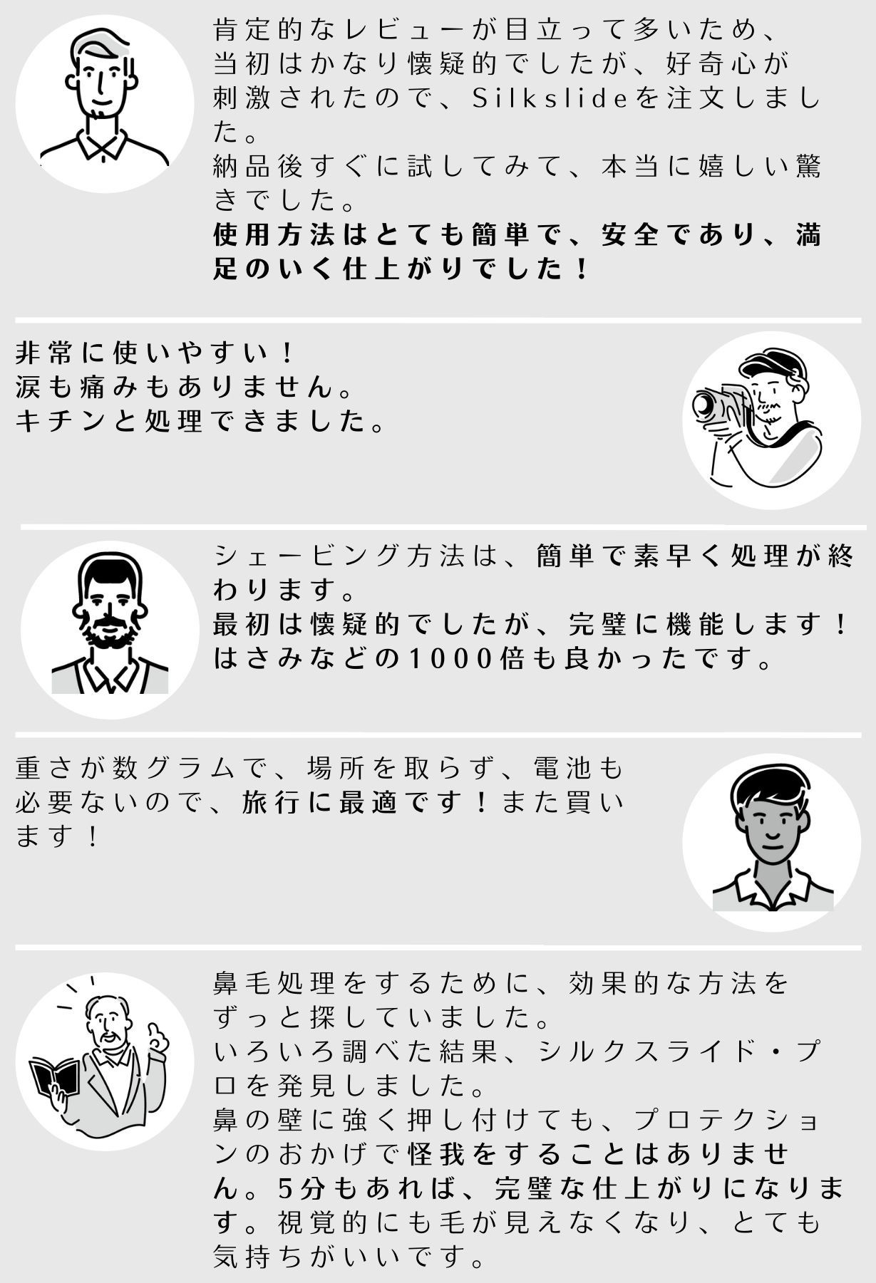 鼻毛を痛い思いをして抜いたり、危険な思いをしてハサミで整えたりする時代はもう終わりです!人間工学に基づいた形状のSilkslide Proは、鼻毛の処理に最適!