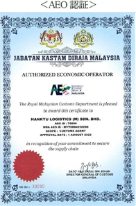 当社マレーシア法人HANKYU LOGISTICS (M) SDN.BHD.は、マレーシア関税局からAEO*制度の認証を8月1日付で取得しました。