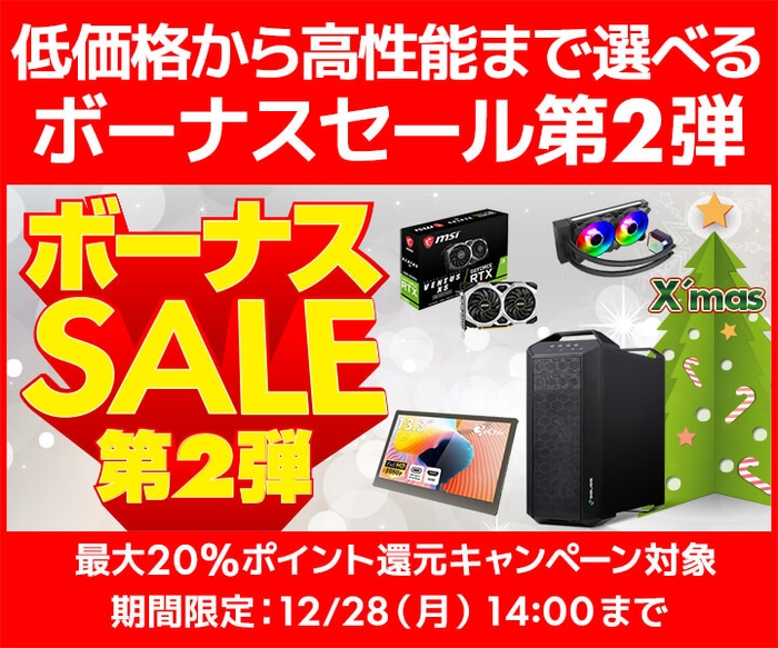 パソコン工房・グッドウィルを運営する株式会社ユニットコム(代表取締役:端田 泰三、本社:大阪市浪速区)は、パソコン工房Webサイトにて、2020年12月28日(月)14時まで低価格から高性能まで選べる『ボーナスセール 第2弾』を開催中です。