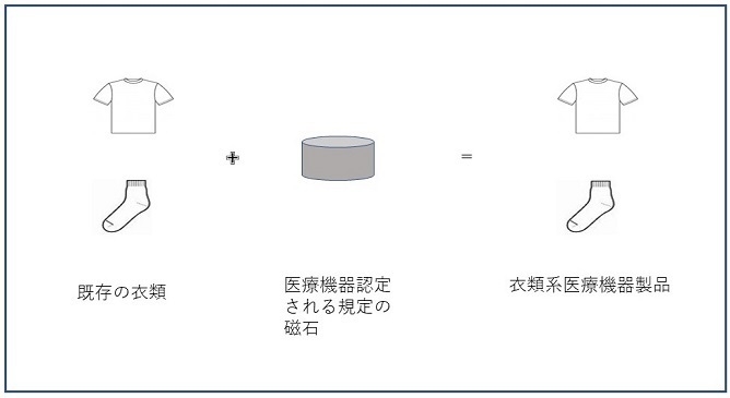 「衣類系医療機器認証サービス」とは、既存の衣類に医療機器認定される規定の磁石を装着し医療機器の認証をし、「雑貨」とされている衣類を「医療機器」にとして認められた衣類にすることができます。そして、装着した磁石によって「血行改善、コリの改善」のある衣類となり、広告として標ぼうすることができます。