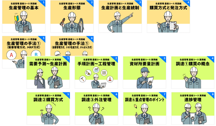 現在、基礎用語を学ぶ『用語編(全6本)』や生産形態の種類などを学ぶ『業務編(全15本)』の動画を配信しています。いずれも1本あたり10分以内で視聴可能で、繰り返し見ることができるように提供致します。
