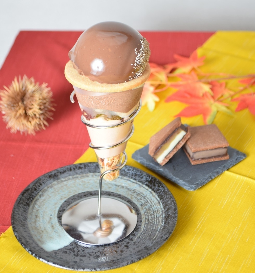 更に、パフェの中見は、栗のクリームとミルクチョコレートムース、当店大人気のチョコレートソフトクリームを美しい層に彩り、チョコレート×栗を一杯のパフェで贅沢に楽しめるメニューに仕上がりました。可愛らしい栗型のケーキと美しい層が重なるパフェは、秋のカフェタイムにぴったりです。秋の時期には栗を使った美味しいスイーツを食べたい!という女性必見です。