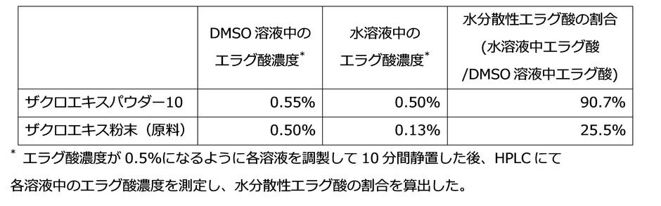エラグ酸は水やエタノール等の各種溶媒に対する溶解性(分散性)が、極めて低いという性質があります。