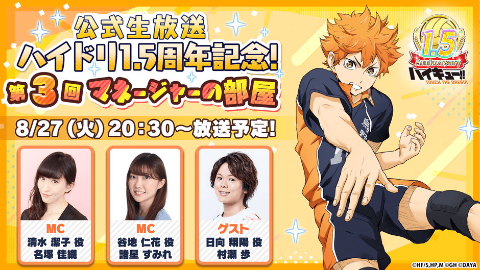 過去にハーフアニバーサリー、1周年で実施した生放送と同様、烏野高校排球部マネージャー清水潔子役「名塚佳織さん」、同じくマネージャーの谷地仁花役「諸星すみれさん」がMCを務めます。今回は烏野高校排球部、日向翔陽役「村瀬歩さん」をゲストとしてお迎えします。