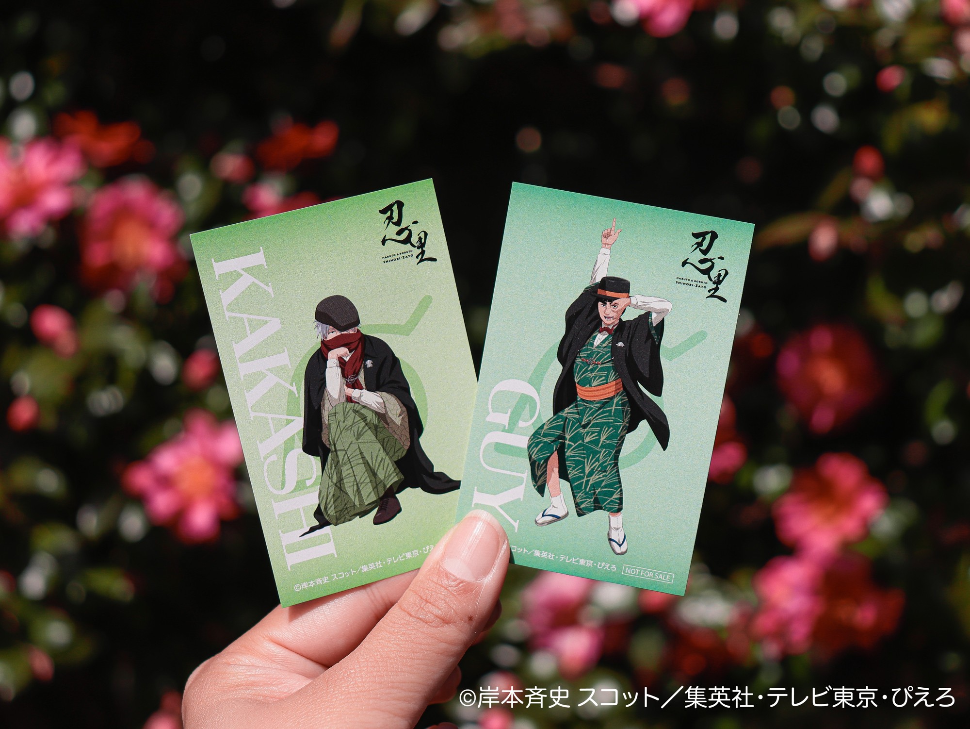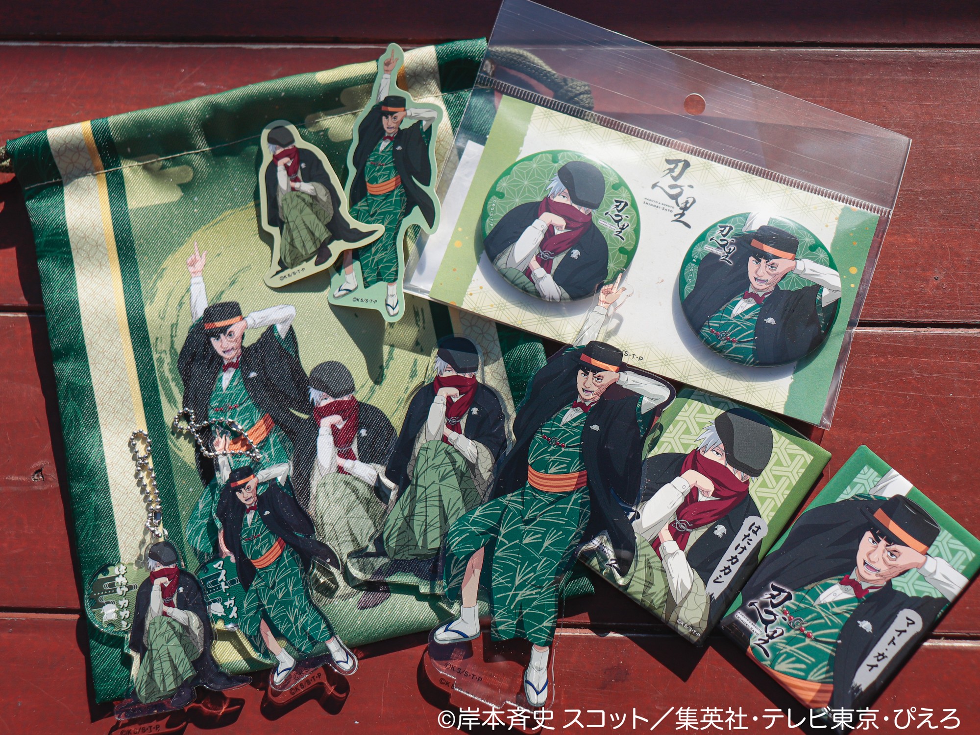 緑の和装に帽子やネクタイがアクセントとなった、オシャレな衣装をまとうカカシとガイの描き下ろしデザインを使用した限定アイテム