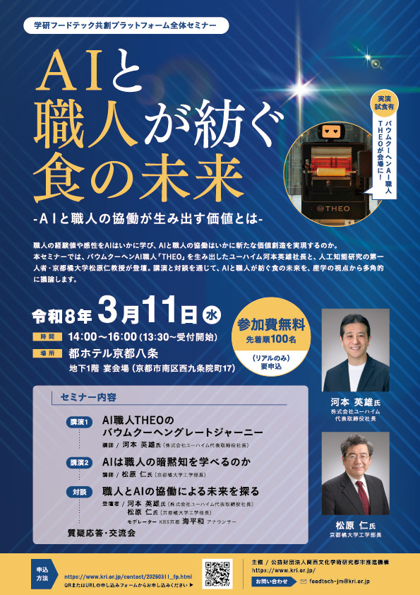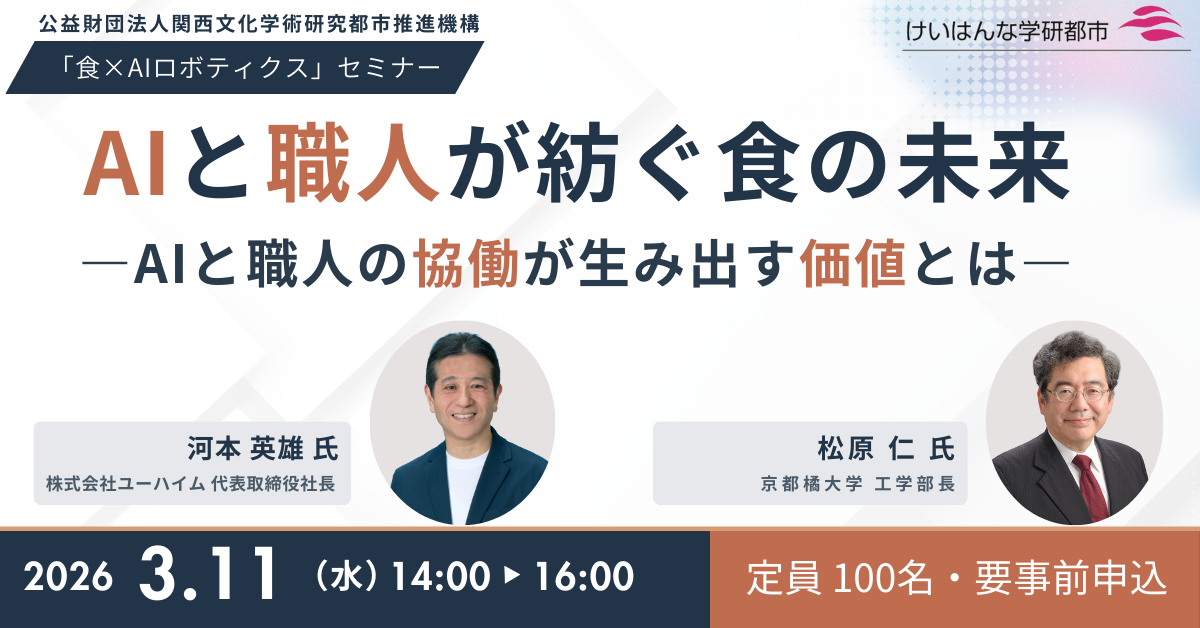 けいはんな学研都市・公益財団法人関西文化学術研究都市推進機構は、学研フードテック共創プラットフォームの取組として「食×AIロボティクス」をテーマにしたセミナーを2026年3月11日(水)に都ホテル京都八条にて開催します。