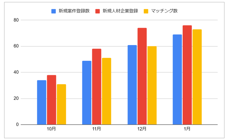 既に本格展開を開始してから約4ヶ月で、新規案件登録数・新規人材企業登録数・マッチング数のいずれも増加している状況となります。(以下図)。(※1)