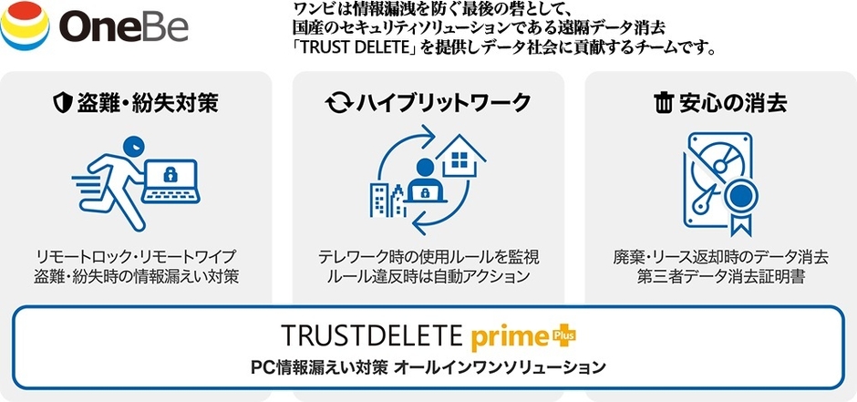ワンビはデータ消去技術で企業の情報漏洩を守るセキュリティソフトウェアの開発企業です。ワークスタイルの変革に伴い、企業においても働く場所や形態、デバイスの活用方法、そしてセキュリティの在り方も変わりつつあります。ワンビはその中でも、盗難・紛失したデバイスの情報漏洩対策として多くの企業で採用されている遠隔データ消去ソリューション「TRUST DELETE(R)(トラストデリート)」で、いつでもどこでも安心してデータを活用できる環境を提供しています。詳細については、 https://www.onebe.co.jp/ をご覧ください。