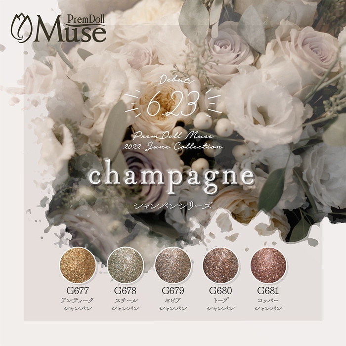 PREMDOLL MUSE(プリムドールミューズ)の中でも大人気の「シャンパンシリーズ」に待望の新色が登場。新たに加わったカラーは、落ち着いたくすみ感のあるゴールドやシルバーなど肌なじみの良いグリッターカラー全5色です。