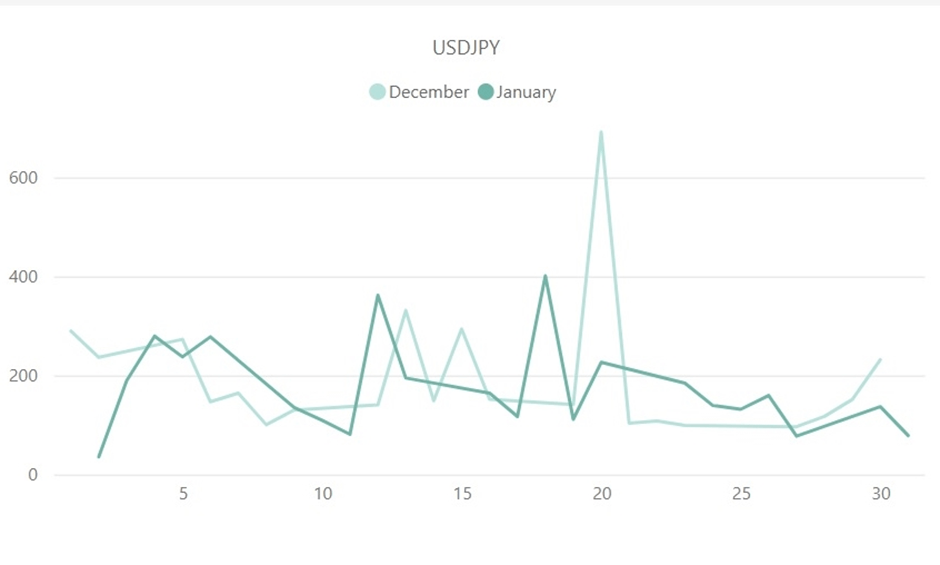 上記は、2022年12月と2023年1月のユーロドル(EUR/USD)のボラティリティ推移を比較したものです。1月のユーロドルの最大ボラティリティを記録したのは3日の163.6pipsで、12月の145.6pipsと比べ約20pips近く増加しました。一方、12月の1日当たりの平均ボラティリティ88.9pipsに対して、1月の平均ボラティリティは88.4pipsでした。また、ボラティリティの推移では、引けより寄り付きに掛けて、1月のユーロドルのボラティリティは高まっていたことが確認できます。18日の日銀会見・金利決定のファンダメンタルズが発表された日は、ユーロドルのボラティリティも上昇にも影響を与えました。