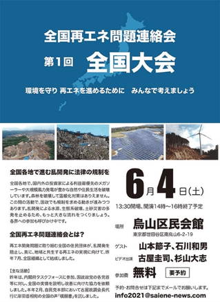 第1回「全国再エネ問題連絡会 全国大会」を 2022年6月4日(土)14時~ 東京都世田谷区にて開催 豊かな自然や地域の環境を破壊しない再生可能エネルギーを!!