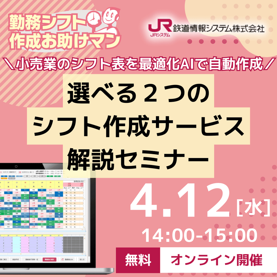 鉄道情報システム株式会社(本社:東京都渋谷区、代表取締役社長:本多 博隆(※)、略称:JRシステム)が運用する、最適化AIでシフト表の自動作成を実現する「勤務シフト作成お助けマン」において、小売業のシフト作成者向けのオンラインセミナー「小売業界シフト作成者必見! 選べる2つのシフト作成サービスの解説セミナー」を2023年4月12日に開催いたします。