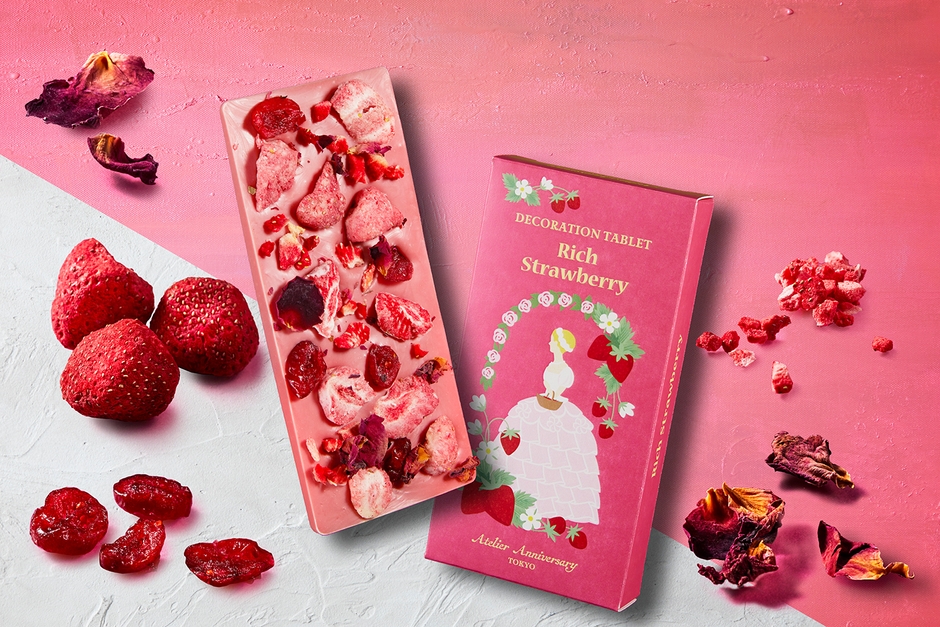 2021年の新作「デコレーションタブレット」全3種(リッチストロベリー・テイスティカカオ・プレミアムピスタチオ)は、アトリエ アニバーサリーらしい華やかな見た目と、一口一口異なる食感や風味が楽しい、華やかなタブレットチョコレートに仕上がりました。身近なご友人が立寄った際はナイフで食べやすく一口サイズにカットして、リモートワークのブレイクタイムには好みの大きさに手で割ってカジュアルにも召し上がれます。