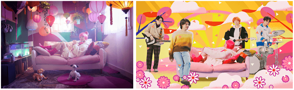最上もがさん扮する「リアルモモ」が、ホットココアを淹れて一息つくシーンから始まります。テレビをつけると、自分によく似たキャラクターが登場するアニメや、楽曲を演奏するOKAMOTO'Sの姿が。“みんなが信じ合って、感謝し合う、優しい世界になったらいいな”と願う、「リアルモモ」の空想世界を描いています。テレビの中でOKAMOTO'Sが演奏していたり、「リアルモモ」がSNS上の言葉と戦ったり、落ち込む女性をキラキラした世界に連れ出したりと、アニメーションを使った演出にもご注目ください。