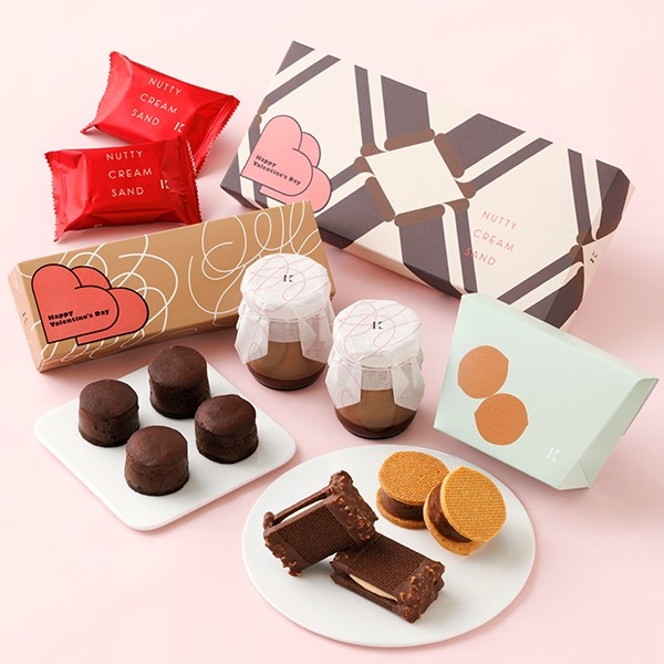 ナッツとチョコレートのマリアージュをお楽しみいただける「ナッティクリームサンド」や、直営農場の放牧牛乳を使った「生チョコプリン」など、季節限定商品もお楽しみいただける、バレンタイン・オンライン限定の特別なセットです。