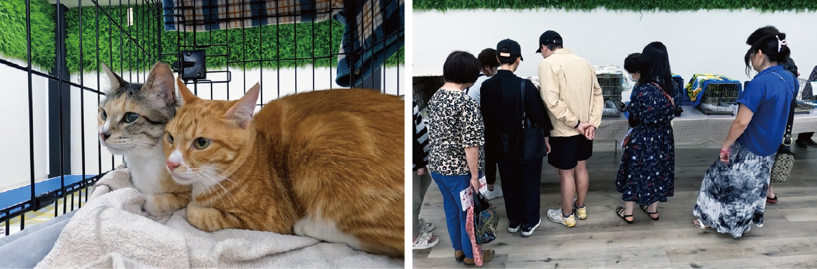 従来のケージ型展示をやめ、家庭のような安心感を再現した「部屋型展示」を導入。犬猫のストレスを軽減し、より快適な環境で展示いたします。また猫部屋上部には生体の習性を発揮できる「猫回廊」を設置いたしました。