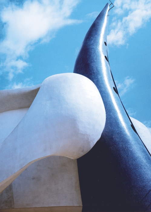 普通の画家の視界にあるのは、絵を描く“板”とそれを飾る“壁”くらいだけど、太郎の脳内座標は3次元で、しかも射程距離がエンドレス。歌舞伎の舞台をつくり、ディスプレイ空間をデザインし、野外広場を制作し、あげくに銀座の夜空にヘリコプターで絵を描き、池袋の駅前に巨大なクリスマスツリーを突き立て、万博会場に70mの巨像を屹立させました。