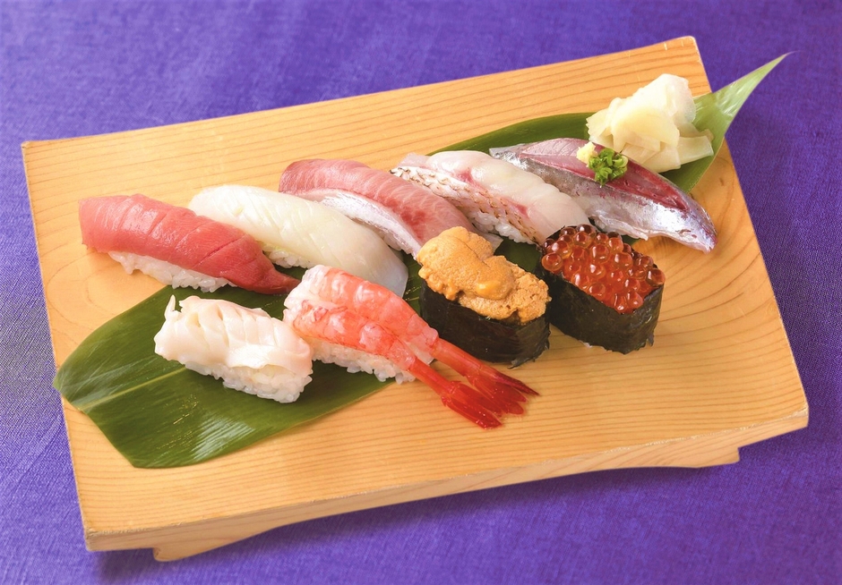 佐渡産の海鮮と、佐渡産のコシヒカリを使用したお寿司。