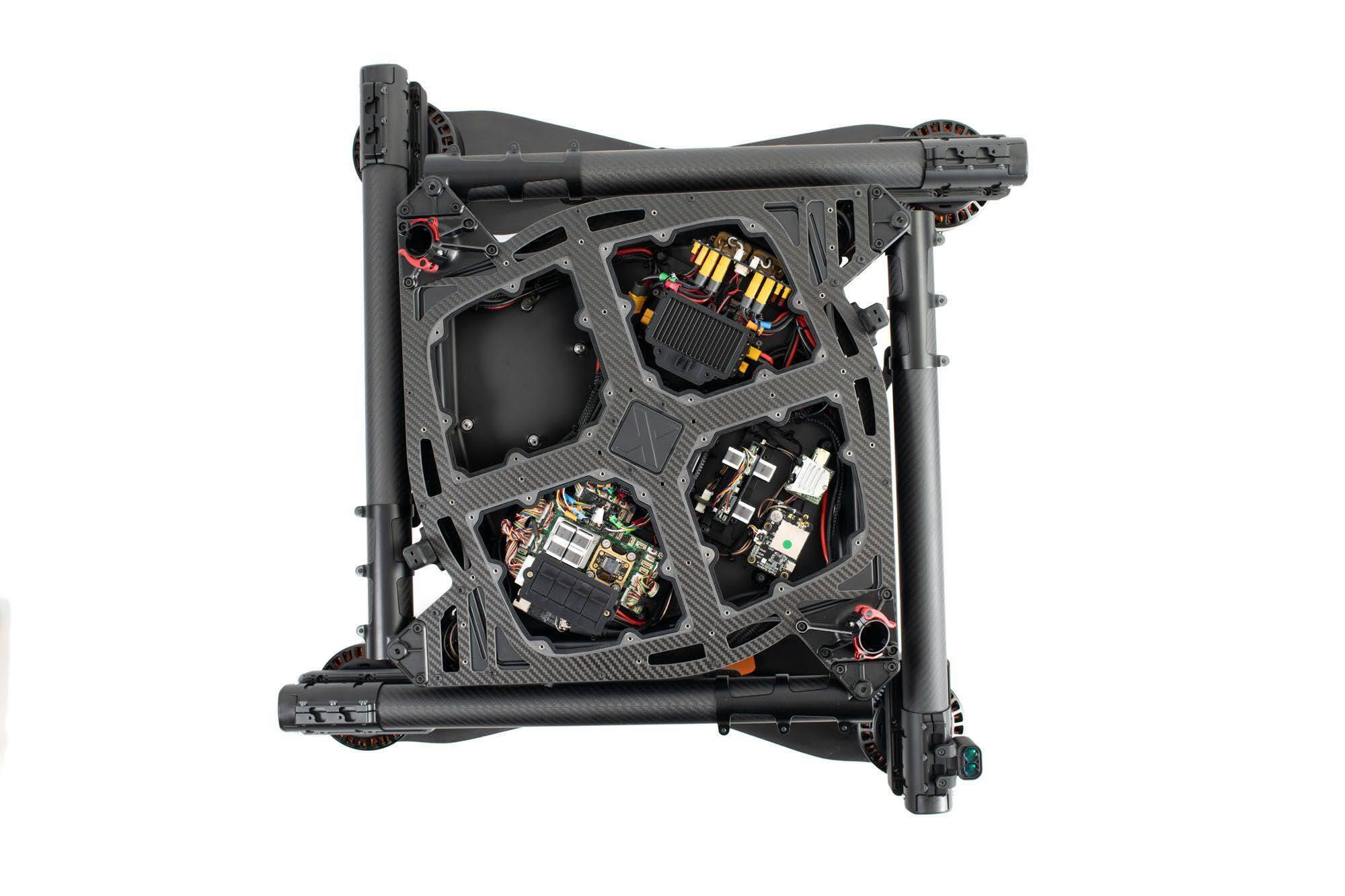 多重化設計による高信頼性カスタムFCと高性能ミッションコンピューターに加え、LTEやMesh Rider無線、カメラ機器などの各種コンポーネントをシームレスに内部に統合しています。