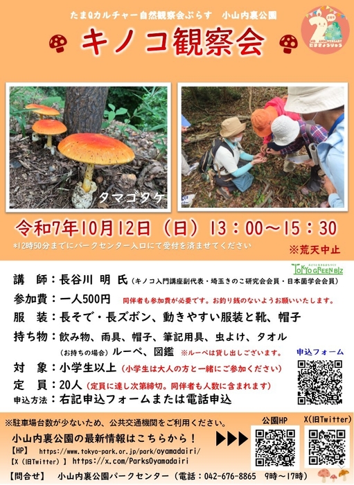 「たまQカルチャー 自然観察会ぷらす 小山内裏公園キノコ観察会」10月12日(日)開催