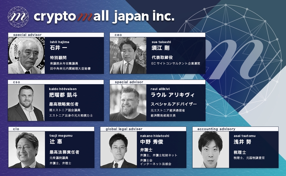 当社「CEO(最高経営責任者)」に「jevgenia kratsko(ヤブゲニア・クラスコ)」。「CSO(最高戦略責任者)」に元大相撲力士で現エストニア国会議員の「把瑠都 凱斗(バルト カイト)」。「スペシャルアドバイザー」に元エストニア経済通信省経済開発部局次長でエストニア共和国における「e-Residency(仮想住民)」確立で指揮をとった「ラウル アリキヴィ」がそれぞれ就任。