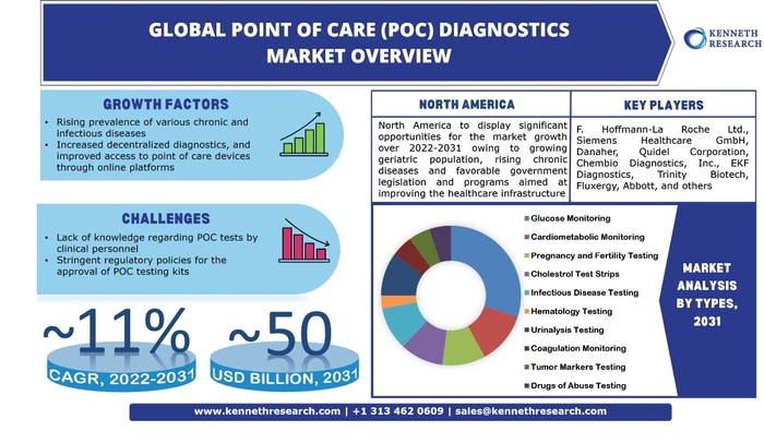 様々な慢性疾患や感染症の増加は、のポイントを採用する必要性を駆動していますケア (POC) 診断。世界のポイントオブケア(POC)診断市場は、2031年末までに約500億米ドルの収益を獲得し、予測期間、すなわち2022年から2031年にかけて約11%のCAGRでさらに成長すると推定されています。POCデバイスによる正確で一貫した調査結果は、市場の成長を促進する重要な要素の1つです。