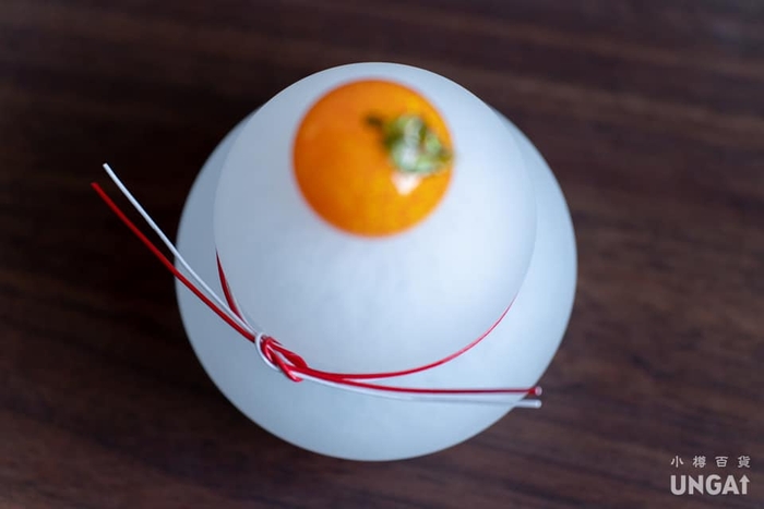 表面にサンドブラスト加工を施し、打ち粉をしたような質感の『白』と、橙を取り外し、中にお米を入れて飾ることができる『クリア』の二種類。サイズはそれぞれ大・中・小の3種類です。毎年使えて、インテリアにもとっても素敵です。